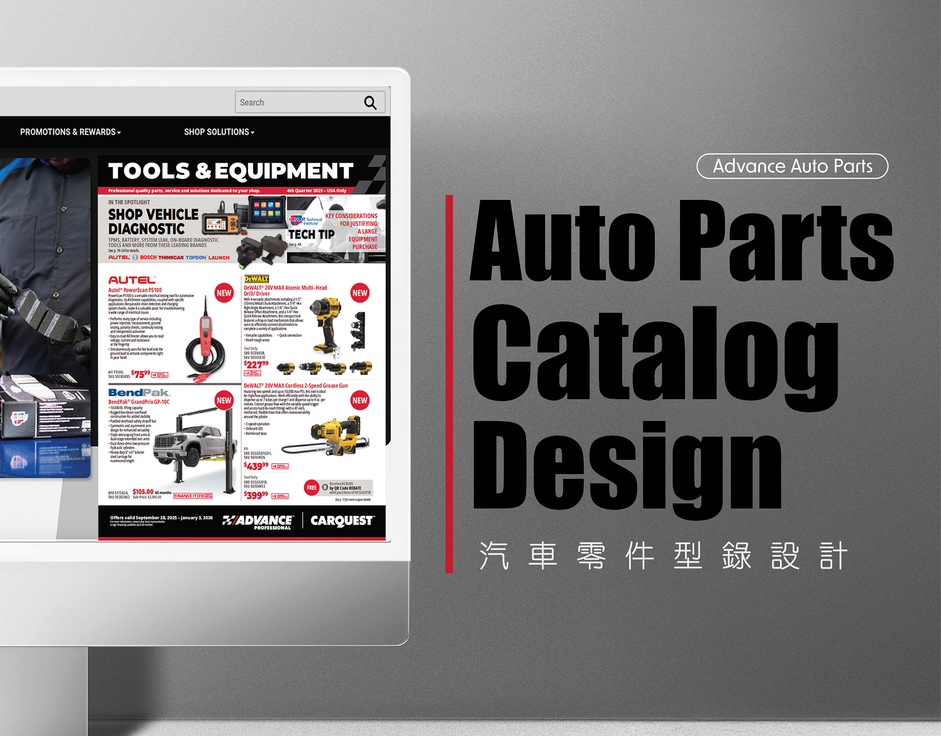 Spent more than three years on the global creative team at Advance Auto Parts, responsible for the Tool & Equipment catalog design as well as the creation of recurring digital marketing assets such as eSpots, banners, and email modules.